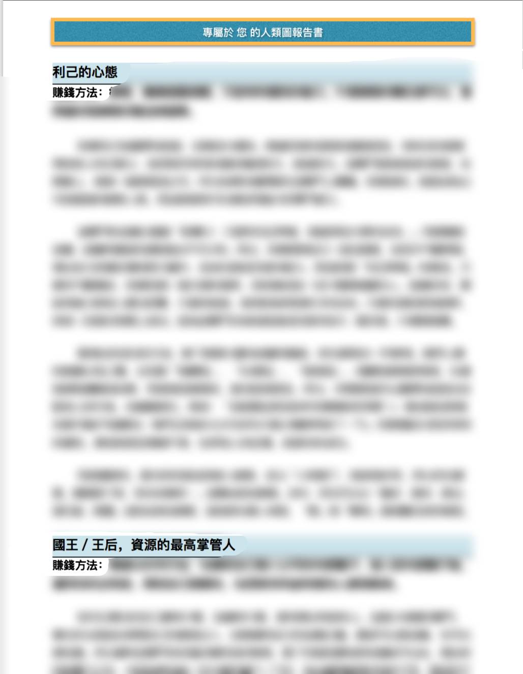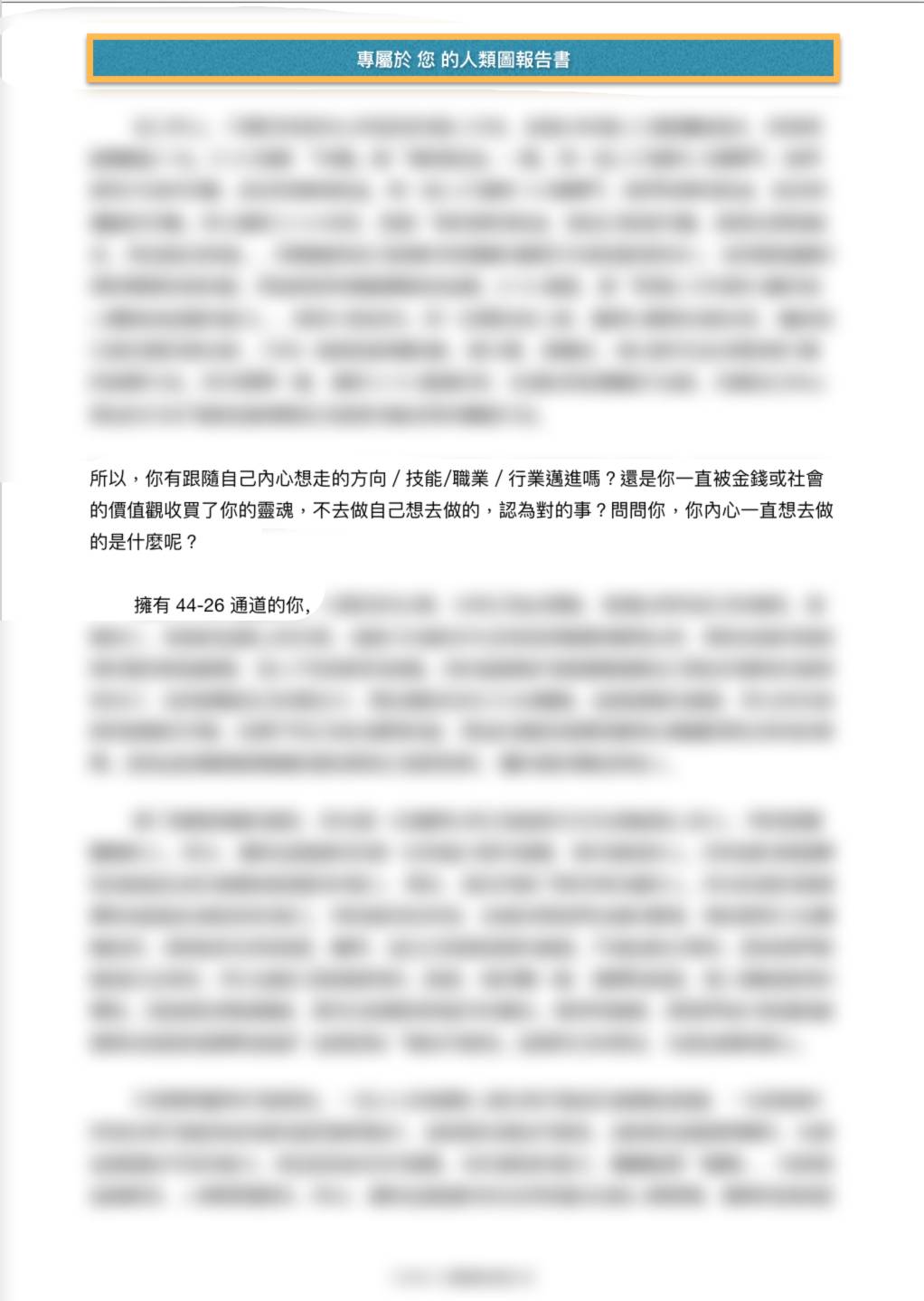 謝謝人類圖報告書團隊!能感受到這份五十多頁的報告書是以極大的用心所完成!閱讀報告書後,這是我人生中首次以這樣的角度來審視自我,我終於明白並接受了這樣被設計的自己,而這樣的體驗給予了我極大的啟發!我甚至反覆閱讀了兩次,每次都能獲得新的領悟,真是令人驚喜!謝謝:)