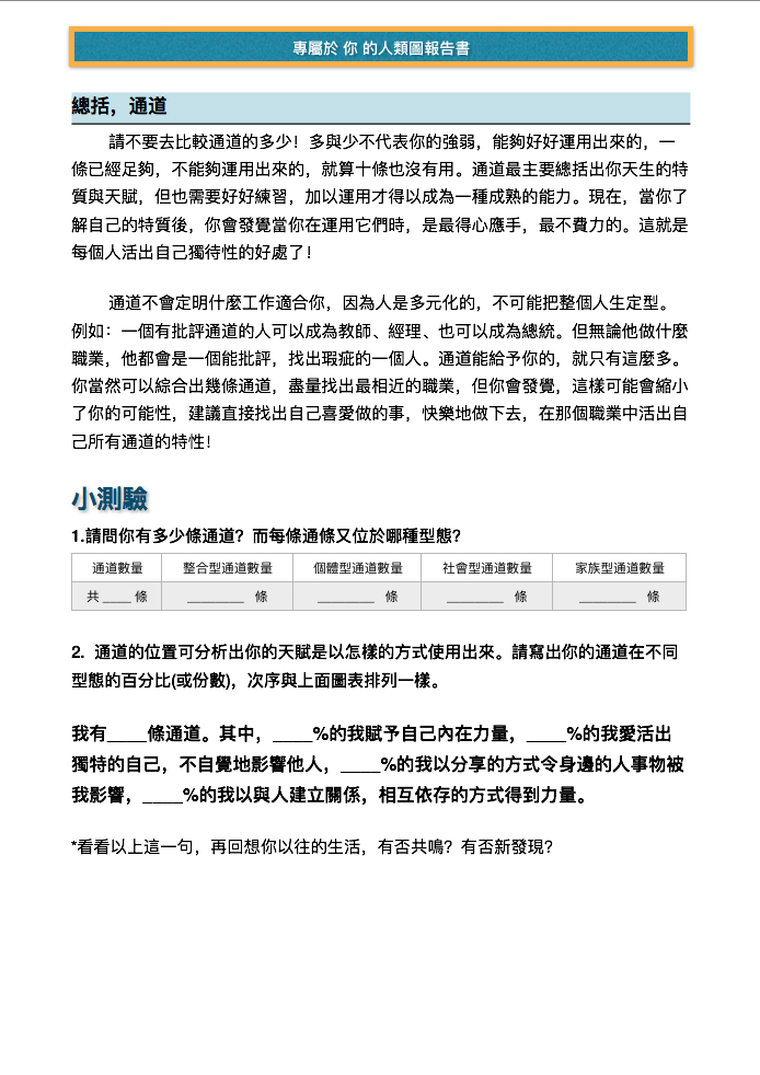 報告書裡的小測驗挺讓人深思,有一些說真的我對於自己的回答不滿意,感覺自己沒活出自己的設計,但是也給予了我努力的方向。